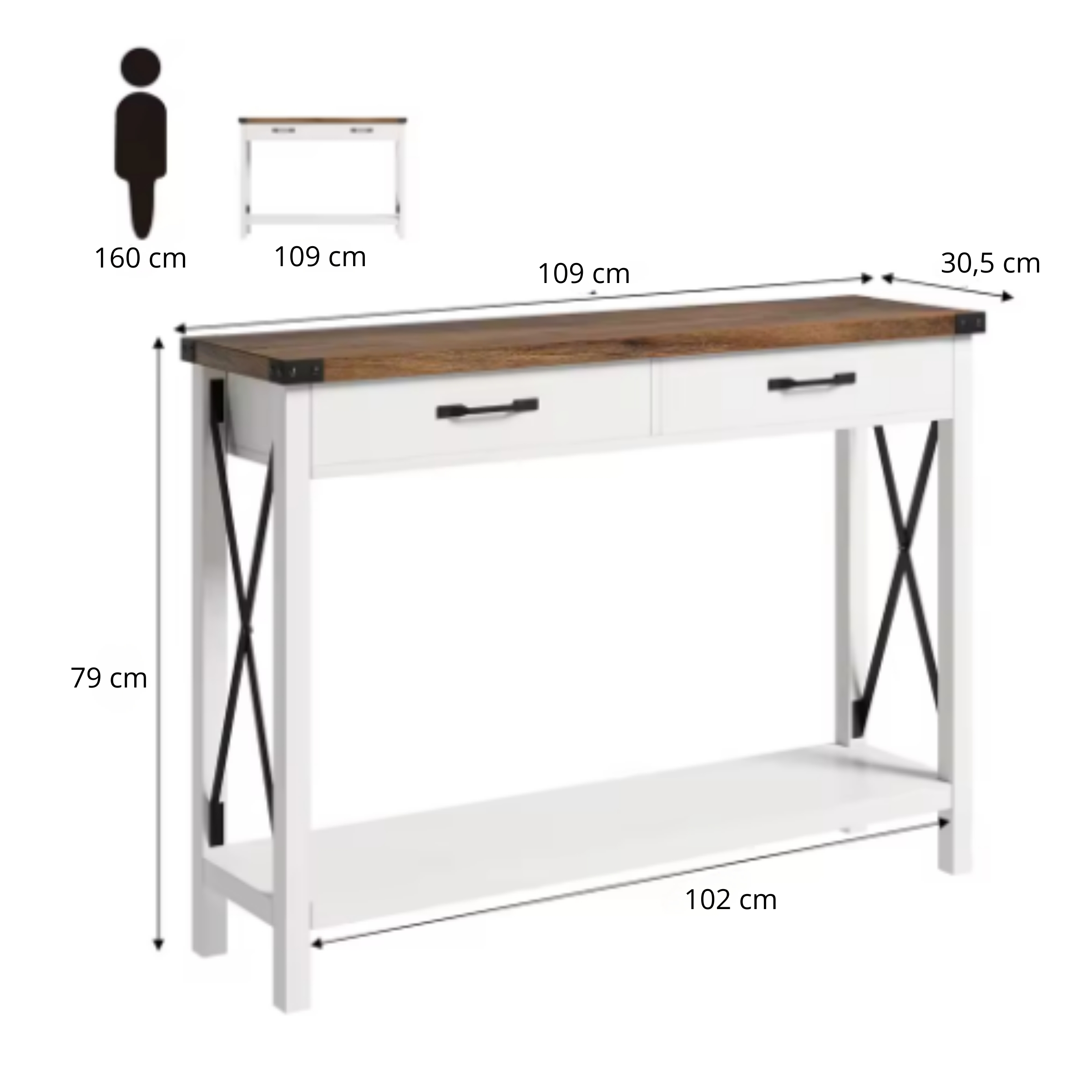 Deux tiroirs profonds pour les clés, papiers, accessoires… et une étagère basse offrant un espace parfait pour paniers, livres ou objets décoratifs.