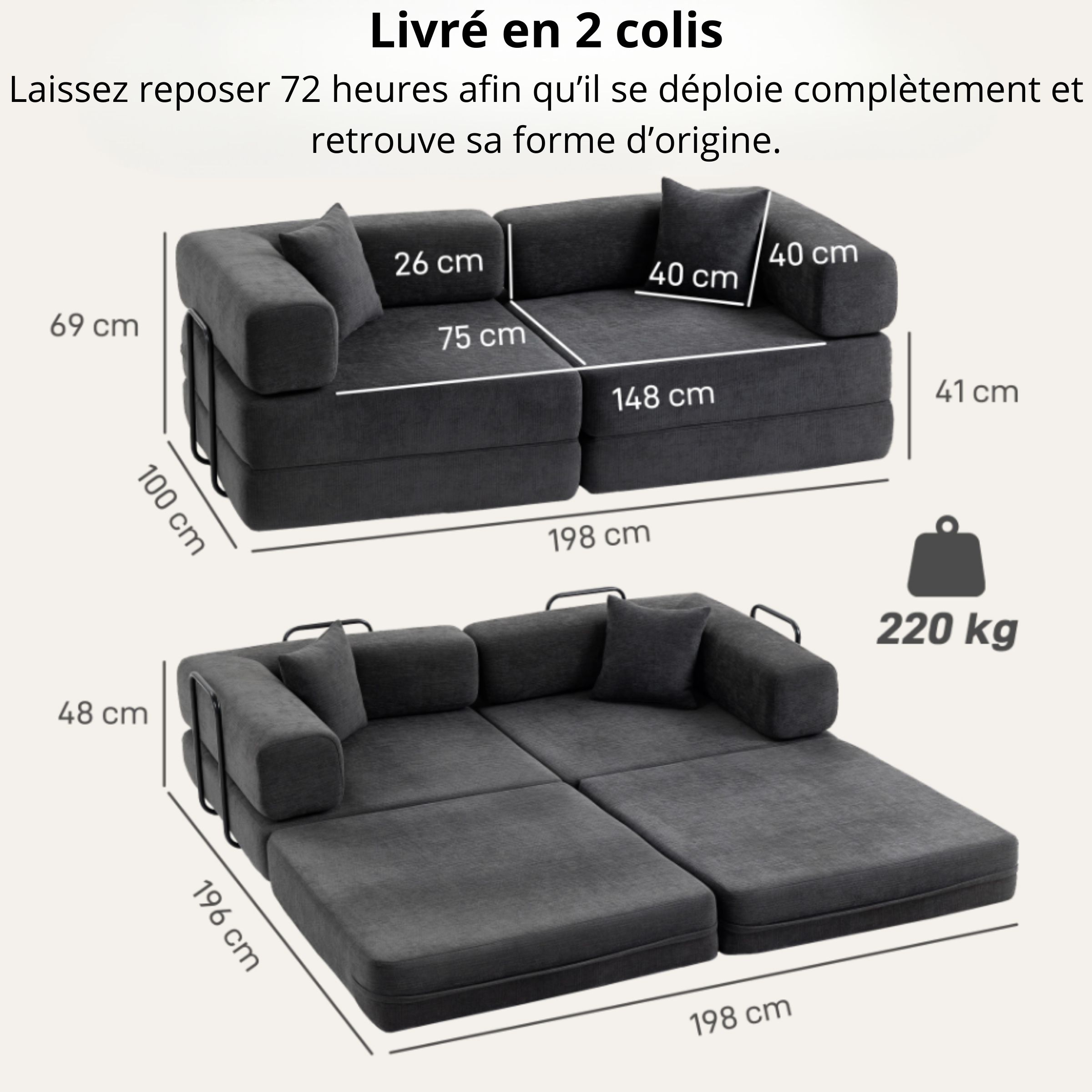 | Dimensions canapé (L×l×H) | 198 × 100 × 69 cm |