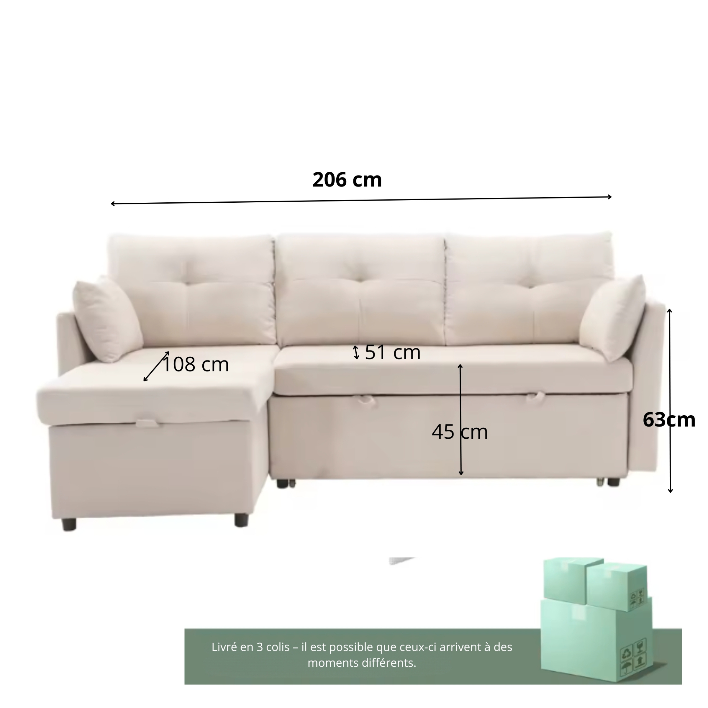 | Spécifications | Dimensions totales : 206 × 130 × 66–88 cm (L × P × H) Largeur d’assise : 123 cm Profondeur d’assise : 51 cm Hauteur d’assise : 45 cm Hauteur du dossier : 43 cm Hauteur accoudoirs : 63 cmMatériaux : • Revêtement : velours côtelé • Rembourrage siège : mousse haute densité • Rembourrage dossier : mousse + revêtement • Structure : contreplaqué et boisFonctions : • Modules interchangeables • Coffre de rangement sous l’assise • Compartiment de rangement latéral • Fonction lit convertibleCapacité de charge totale : ~226 kg Assemblage : requis |