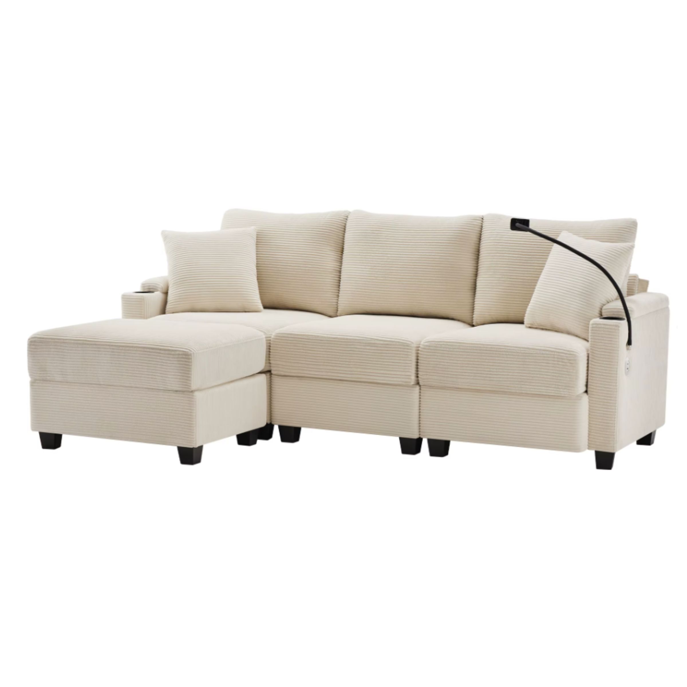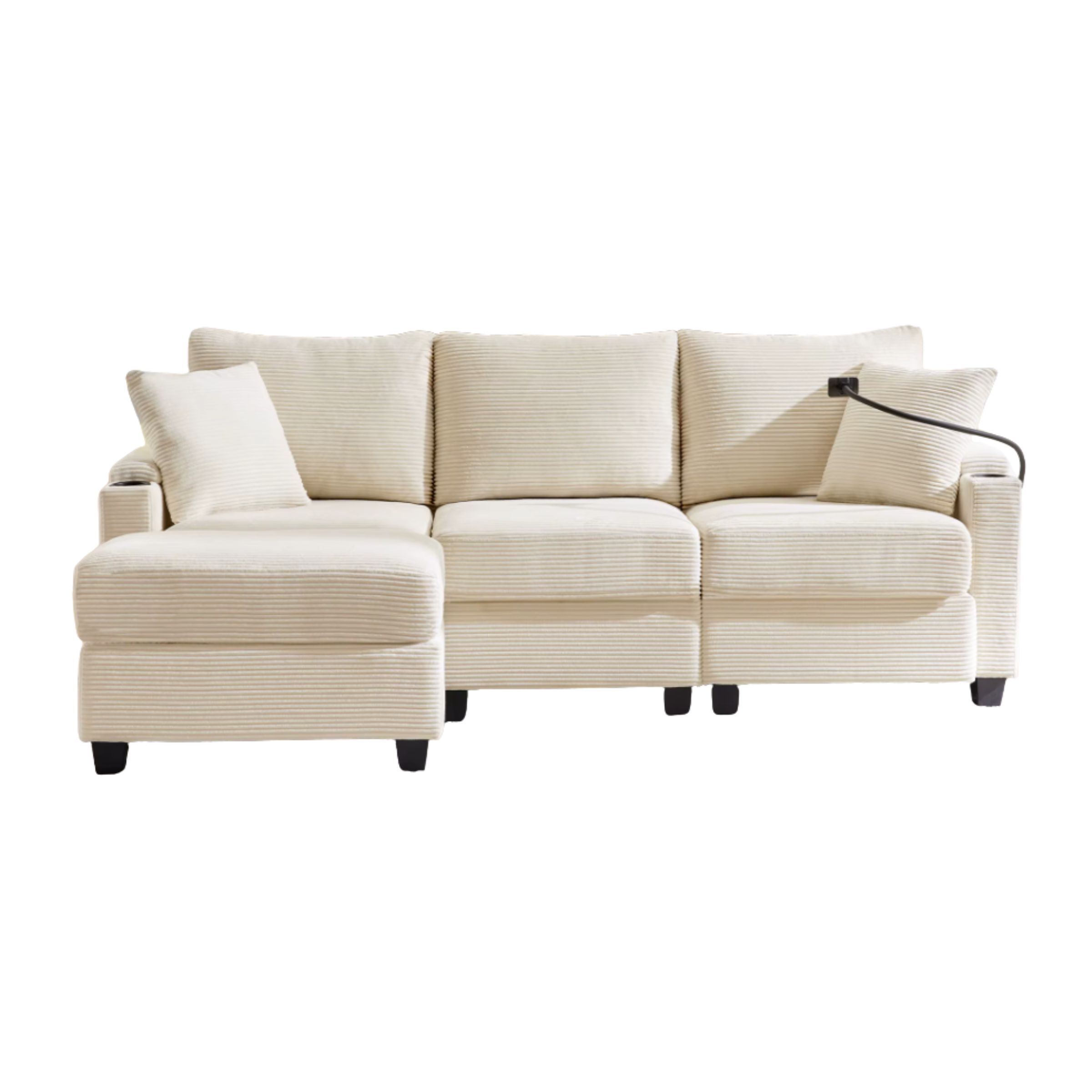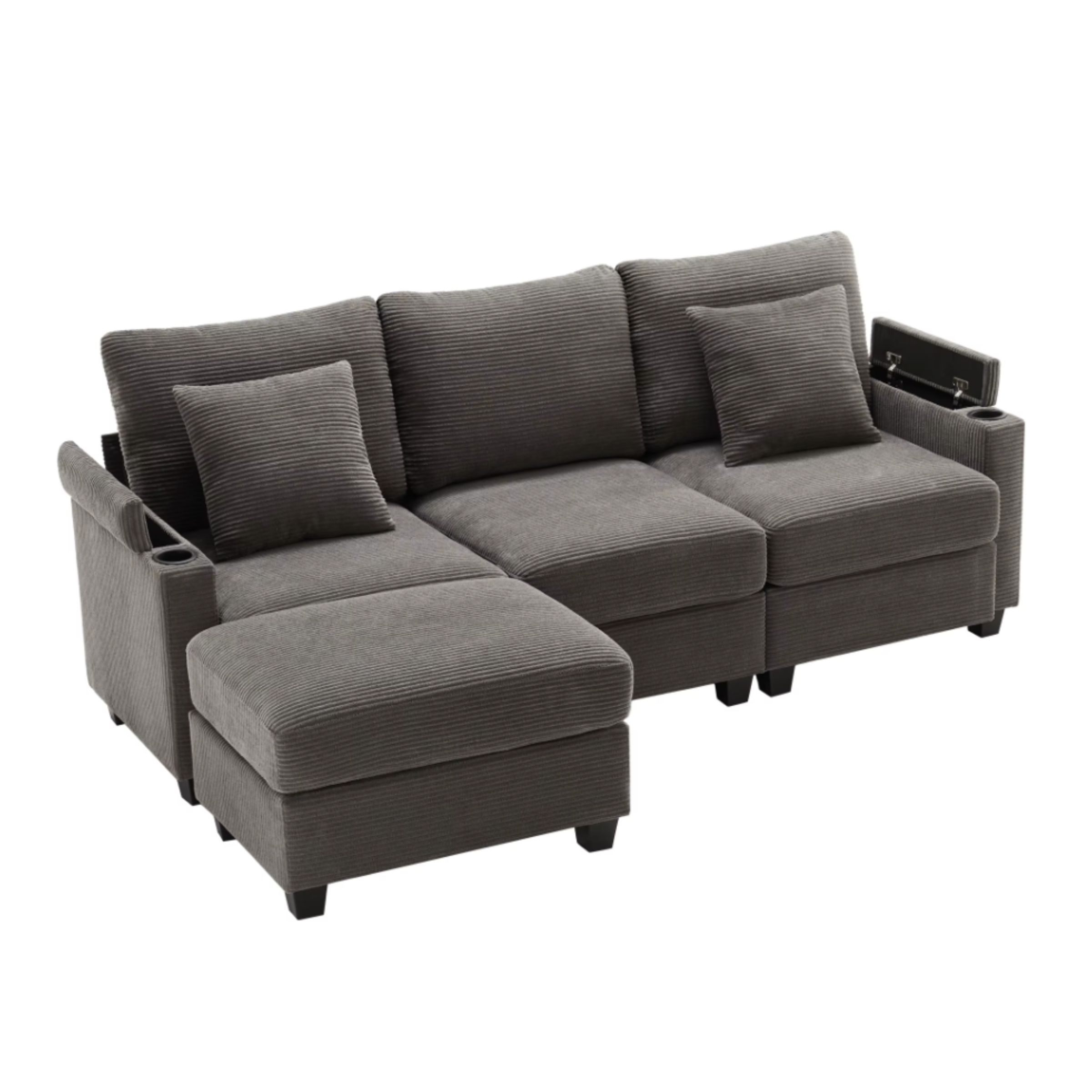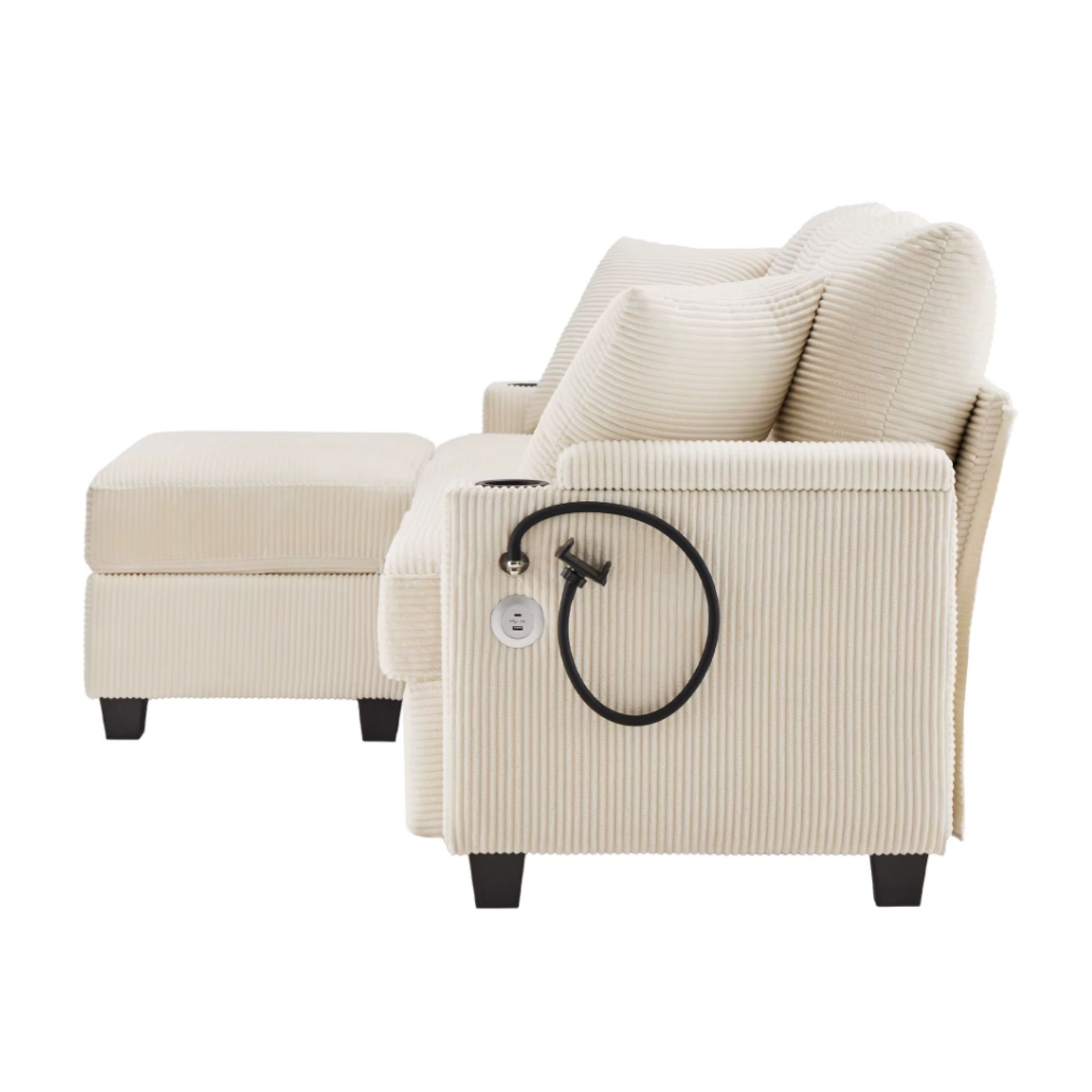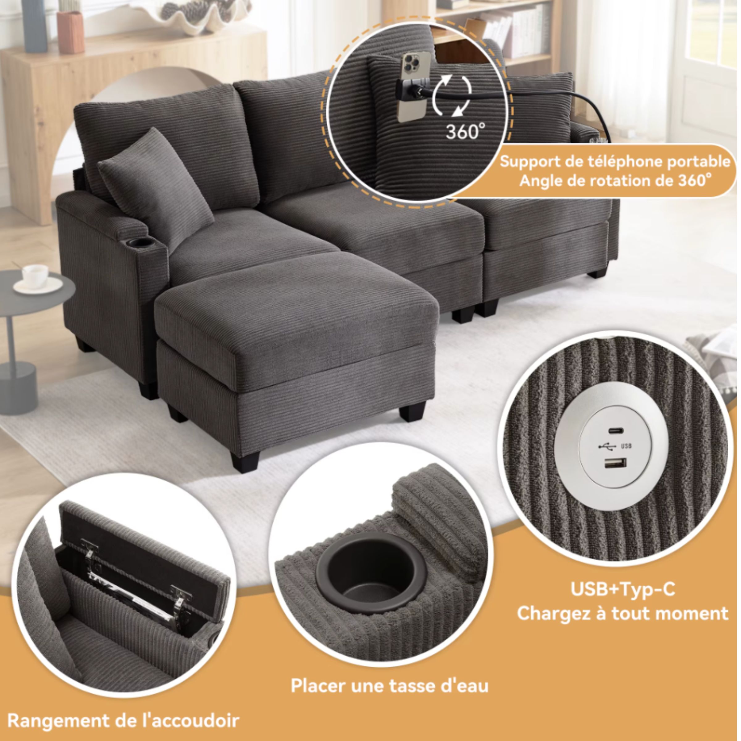 Pensé pour un usage moderne, ce canapé intègre un support de téléphone multifonction ainsi qu’un port USB latéral, pour recharger vos appareils sans quitter votre confort. Les accoudoirs ouverts avec rangements intégrés permettent de garder télécommande, téléphone ou écouteurs à portée de main, tout en conservant un salon ordonné.