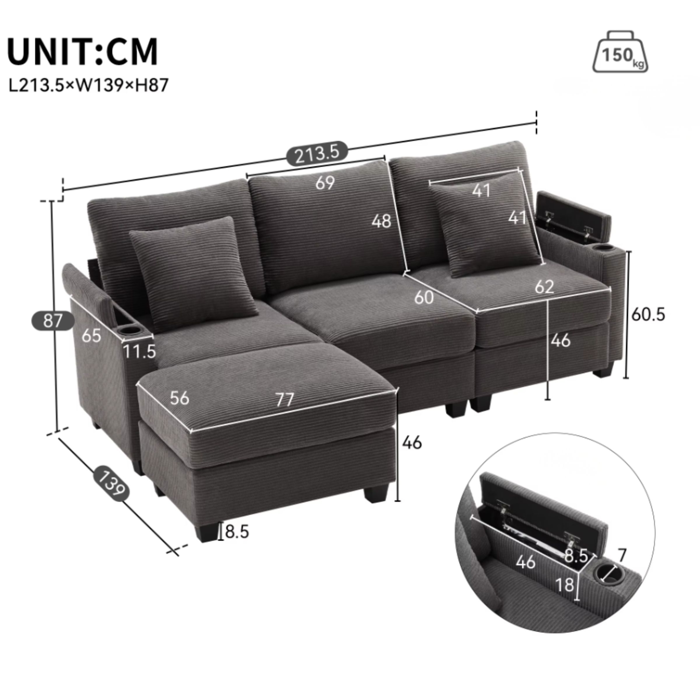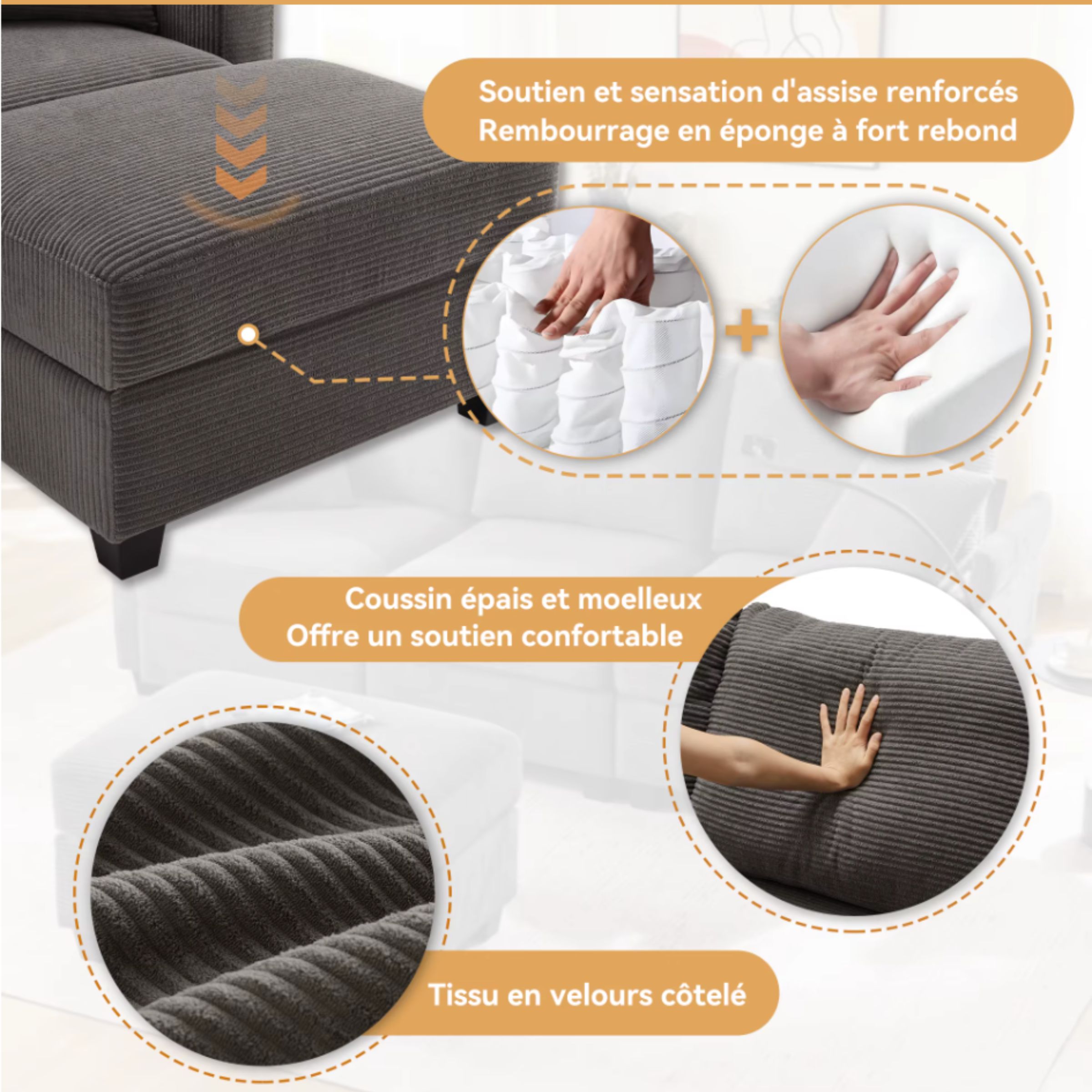 Son revêtement en tissu cordon de haute qualité est à la fois doux, souple et agréable au toucher, créant une atmosphère chaleureuse et relaxante. L’assise repose sur une combinaison de mousse haute densité et de ressorts ensachés, garantissant un excellent maintien, une bonne élasticité et une durabilité renforcée dans le temps.