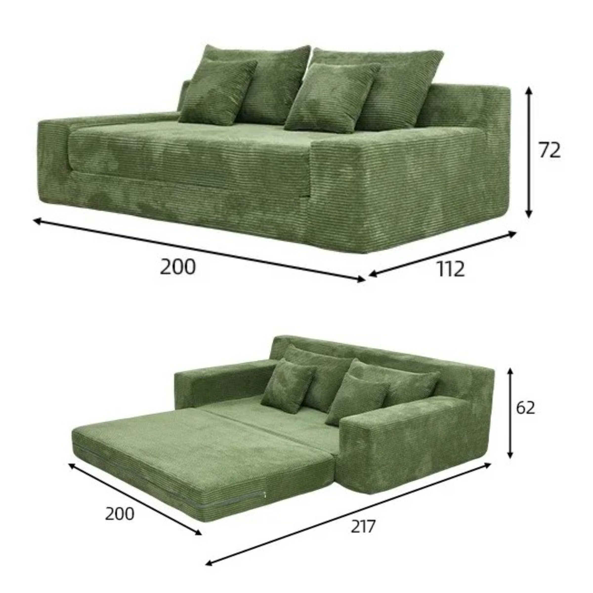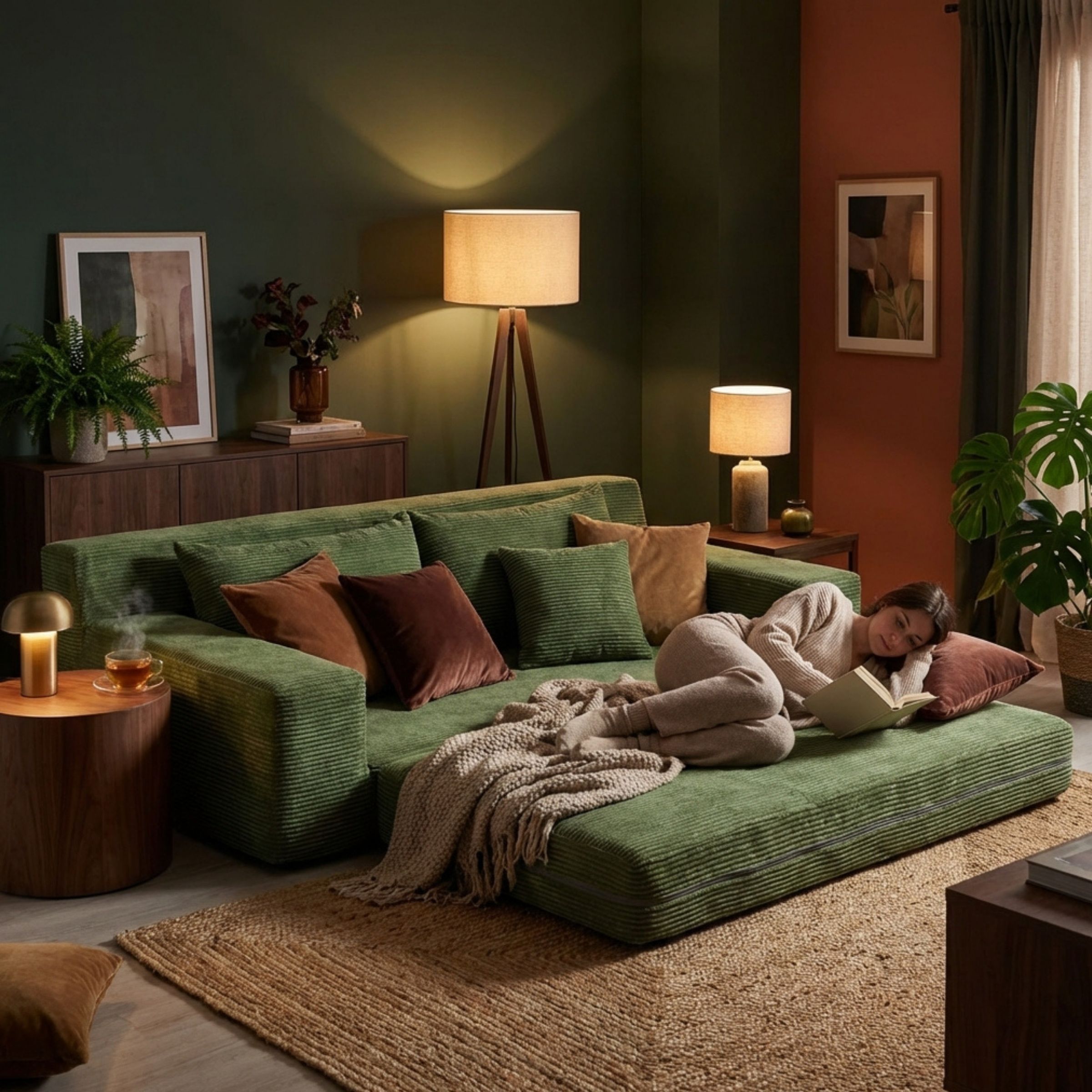 Son rembourrage en mousse haute densité et son tissu doux type velours côtelé offrent un confort enveloppant, aussi bien en assise qu’en couchage.