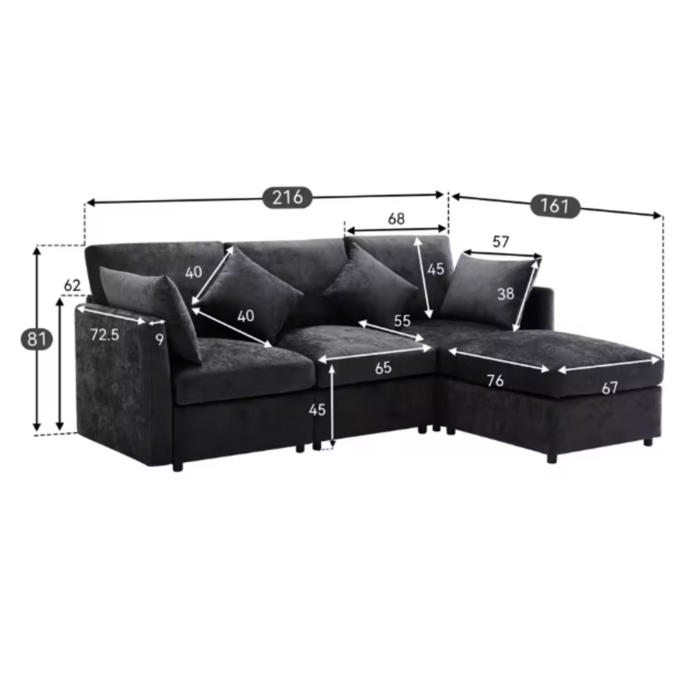 | Spécifications | Dimensions totales : 216 × 161 × 81 cm Hauteur totale : 81 cm Profondeur méridienne : 76 cm Profondeur d’assise : 55 cm Largeur d’assise (segment central) : 65 cm Hauteur d’assise : 45 cm Hauteur dossier (depuis l’assise) : 57 cm Hauteur accoudoirs : 62 cm Matériau structure : bois massif + panneaux Revêtement : tissu chenille Matériau rembourrage : mousse haute densité + coton soyeux Combinaison : Forme L – méridienne interchangeable Poids supporté : 150 kg par siège Montage : à assembler soi-mêm |