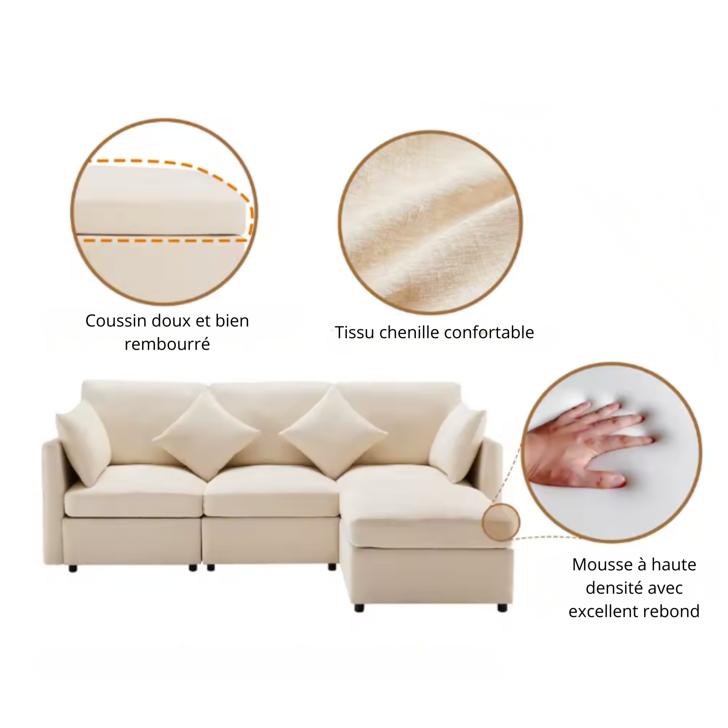 Canapé d’angle modulable en tissu chenille doux, assises haute densité, repose-pieds mobile, dossier moelleux. Idéal pour appartements, petits salons et studios.