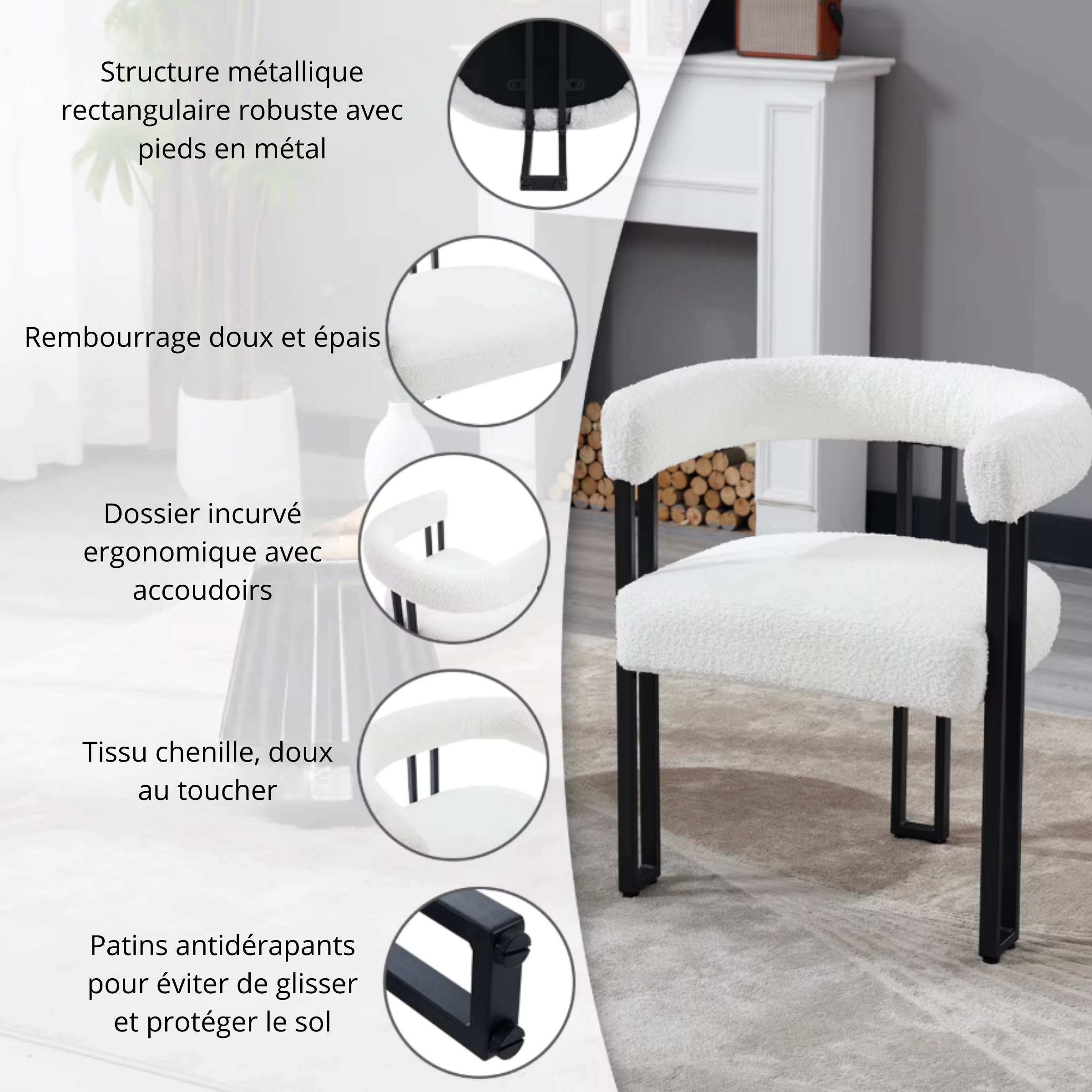 Lot de 2 chaises en velours chenille au design moderne, dossier rond creux, accoudoirs intégrés et pieds métal ultra-stables. Confort supérieure, style tendance et robustesse idéale pour la salle à manger ou le salon.