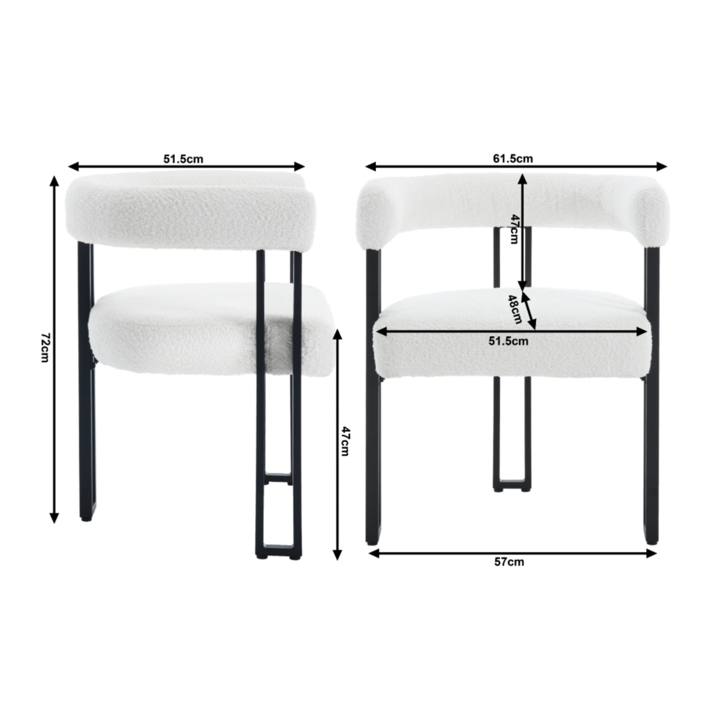 | Spécifications | Matériau de l’assise : tissu chenille + mousse HD Structure : pieds en métal noir Couleurs disponibles : gris foncé / crème Dimensions totales : 61,5 × 72 × 51,5 cm (L × H × P) Dimensions du siège : 51,5 × 48 cm Hauteur d’assise : 47 cm Hauteur du dossier : 26,5 cm Poids net/brut : ~8 / 9,5 kg par chaise Capacité de charge : 150 kg Nombre de pièces : lot de 2 chaises Rotative : non Méthode d’installation : assemblage simple |