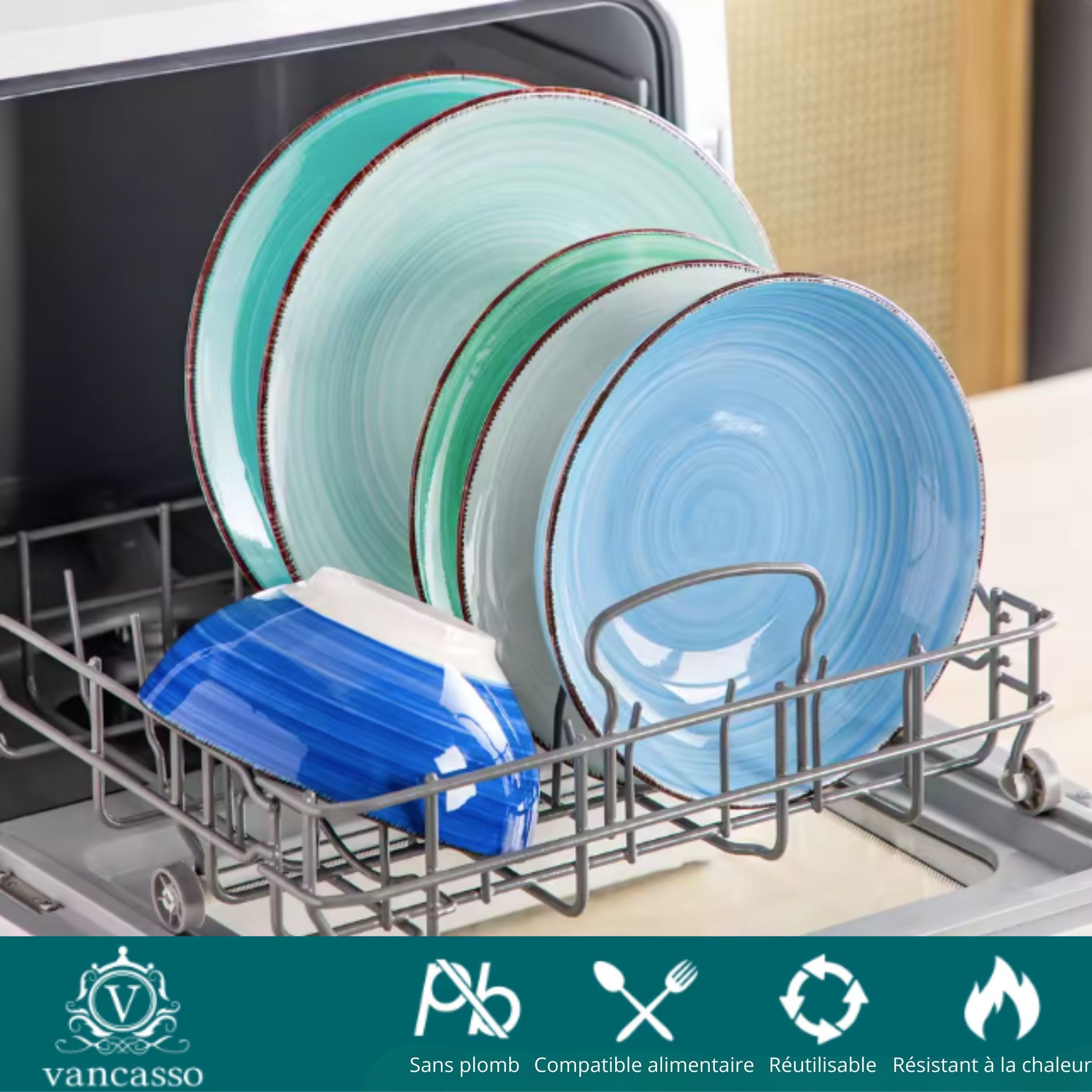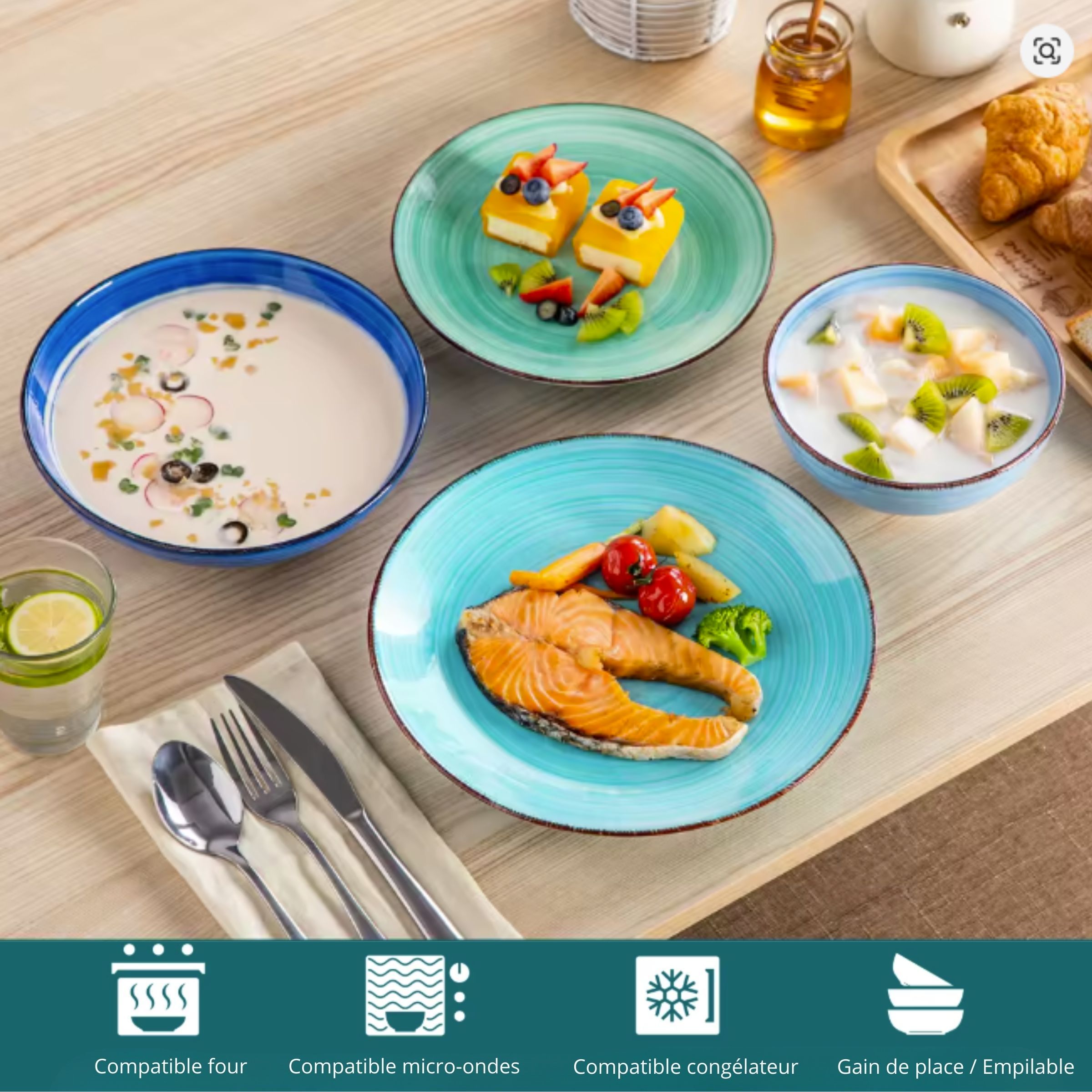 Fabriquée en porcelaine haute densité certifiée alimentaire, cette vaisselle est conçue pour un usage quotidien intensif : résistante aux rayures, aux chocs légers et aux variations de température. Compatible micro-ondes et lave-vaisselle, elle conserve son éclat et sa couleur dans le temps.