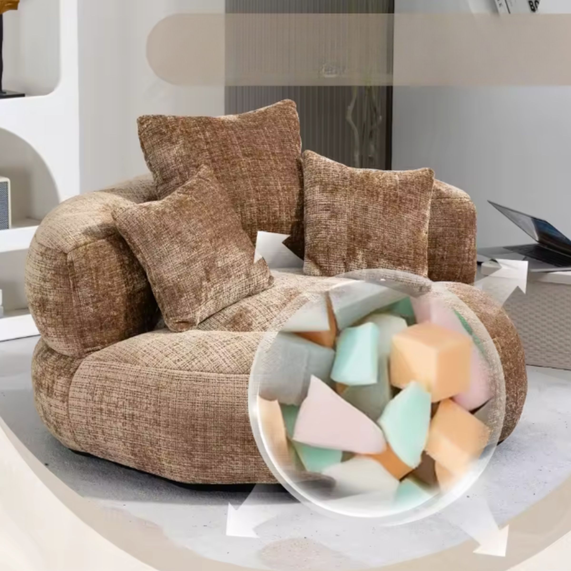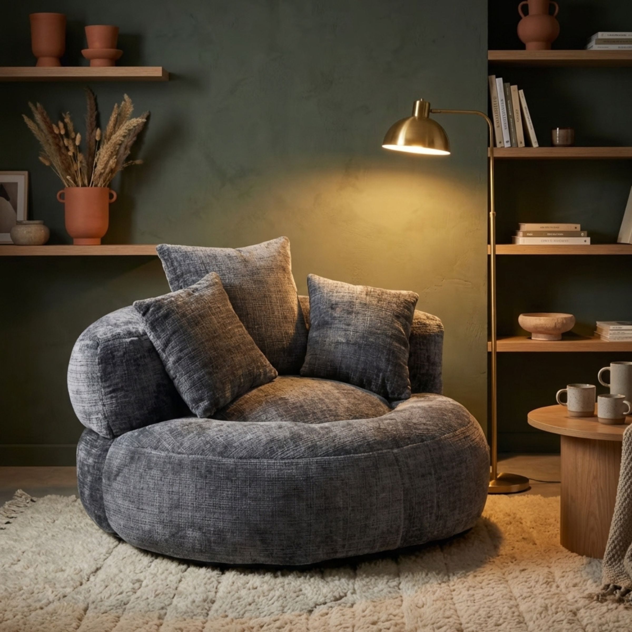 Sans structure rigide ni cadre en bois, il procure une sensation de cocon moelleux, parfaite pour lire, regarder un film, jouer ou simplement faire une sieste. Son revêtement en chenille apporte une texture chaleureuse et tendance, tout en renforçant l’aspect cosy de votre intérieur.