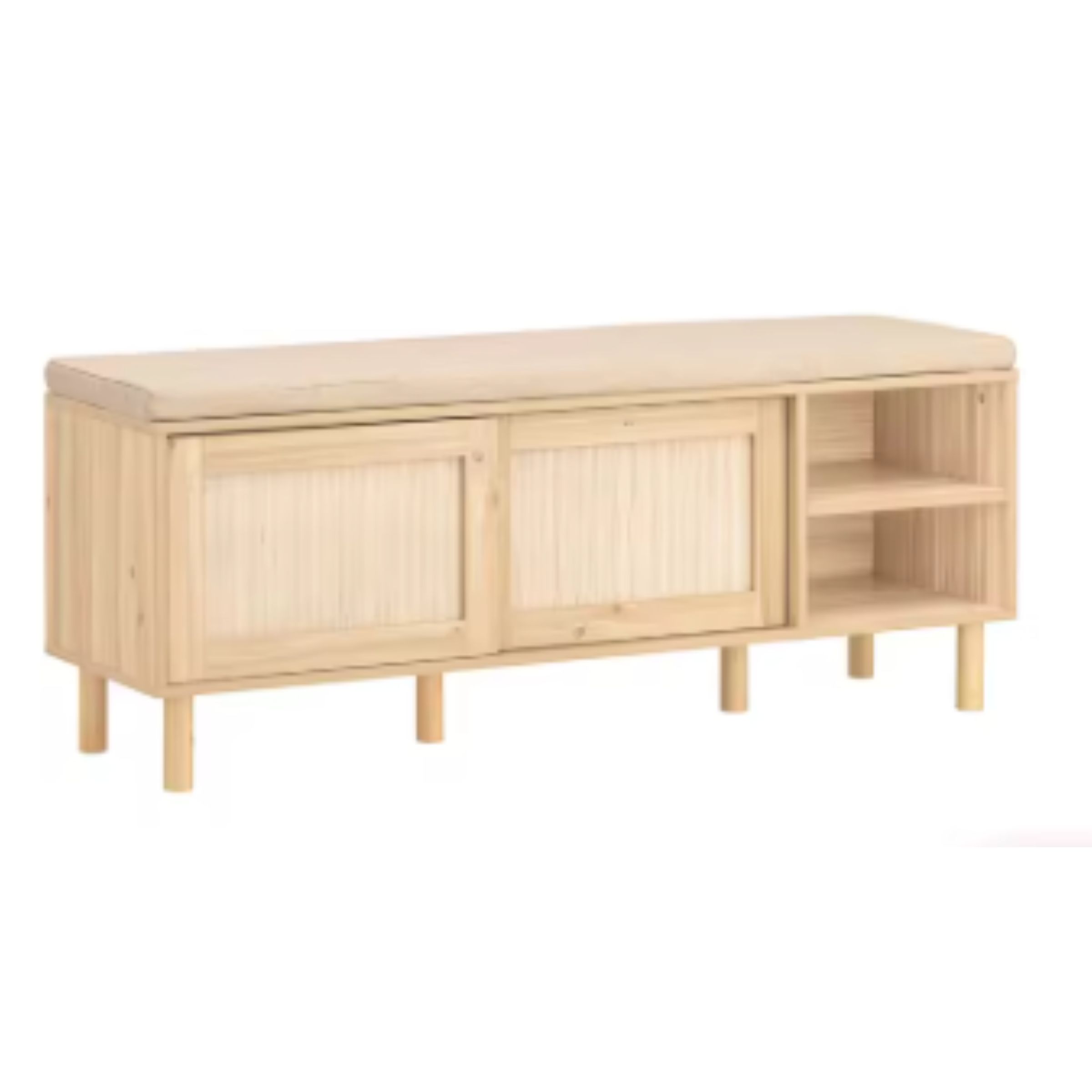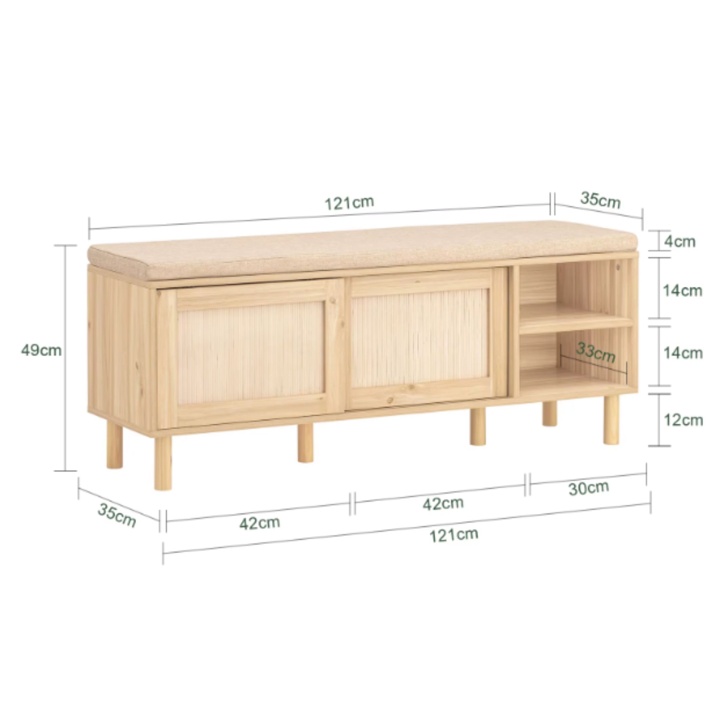 Banc à chaussures en MDF et bambou au style campagne moderne, avec portes coulissantes, grande capacité de rangement et assise confortable. Idéal pour une entrée organisée, chaleureuse et fonctionnelle.