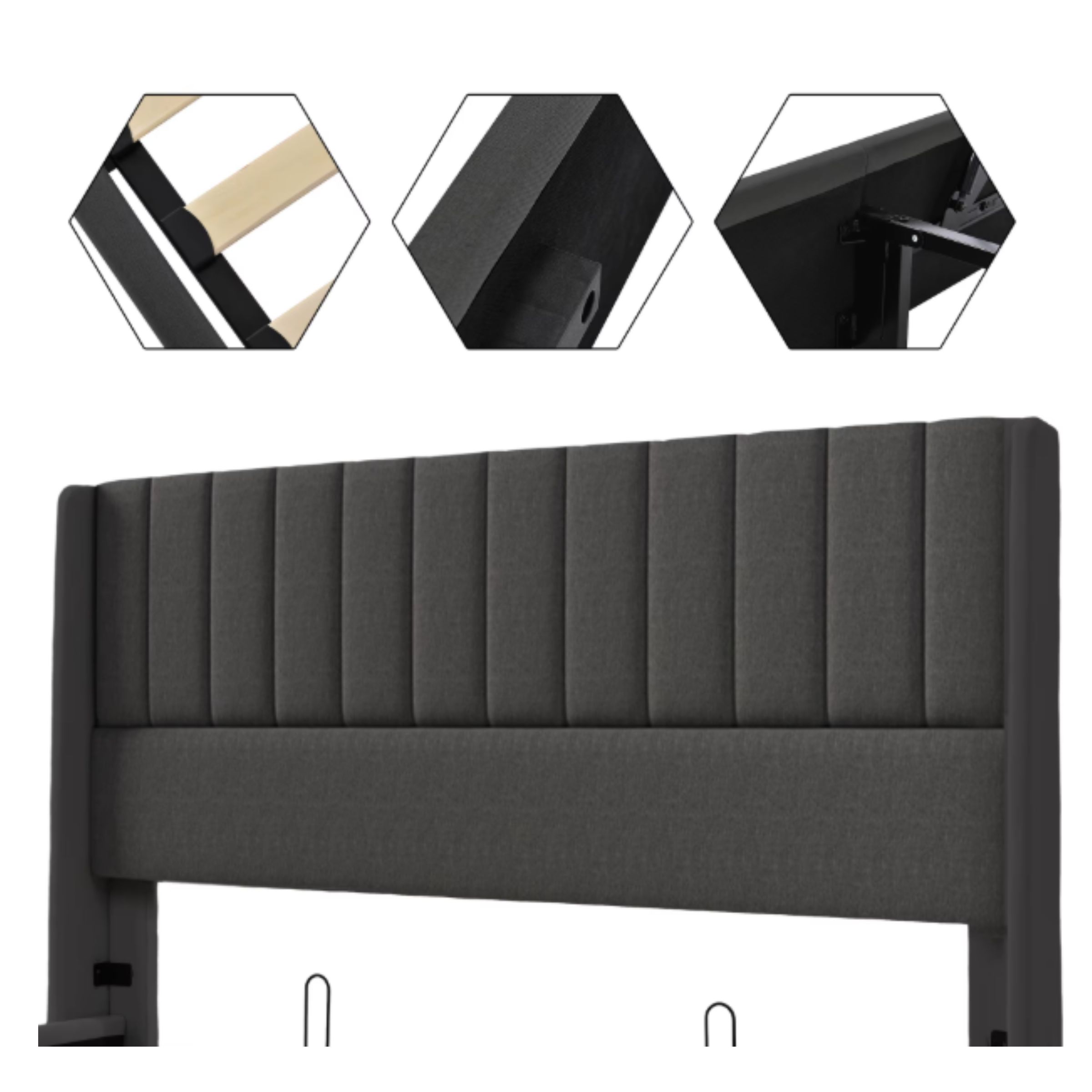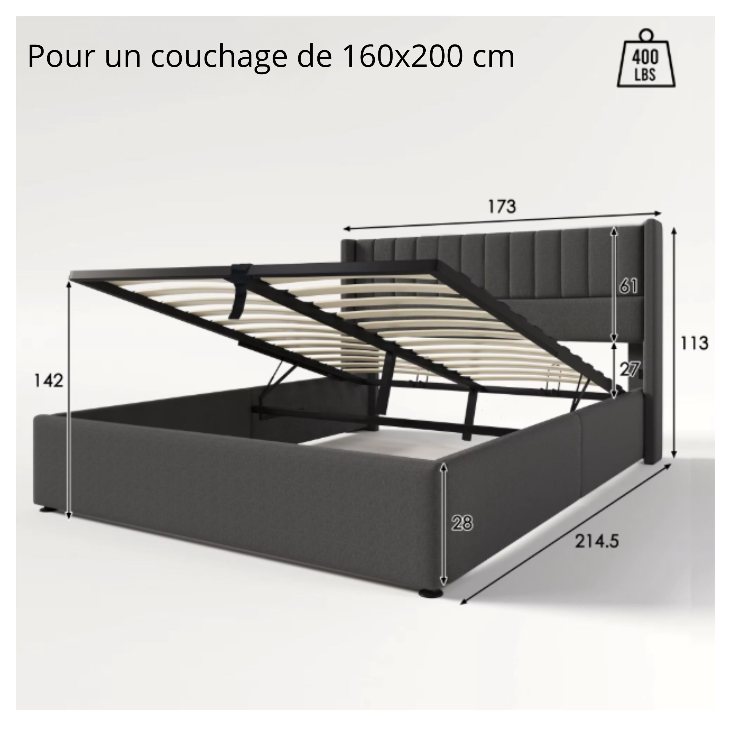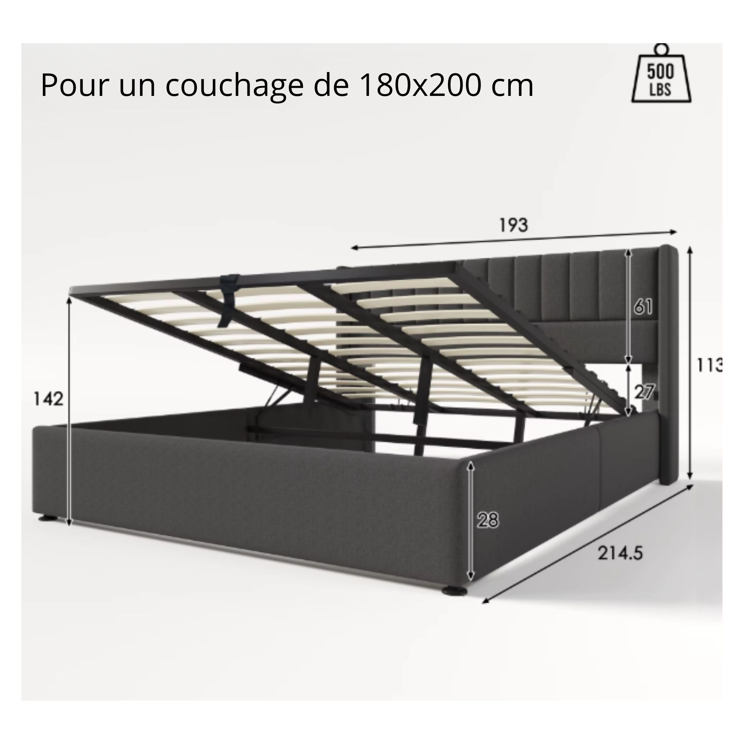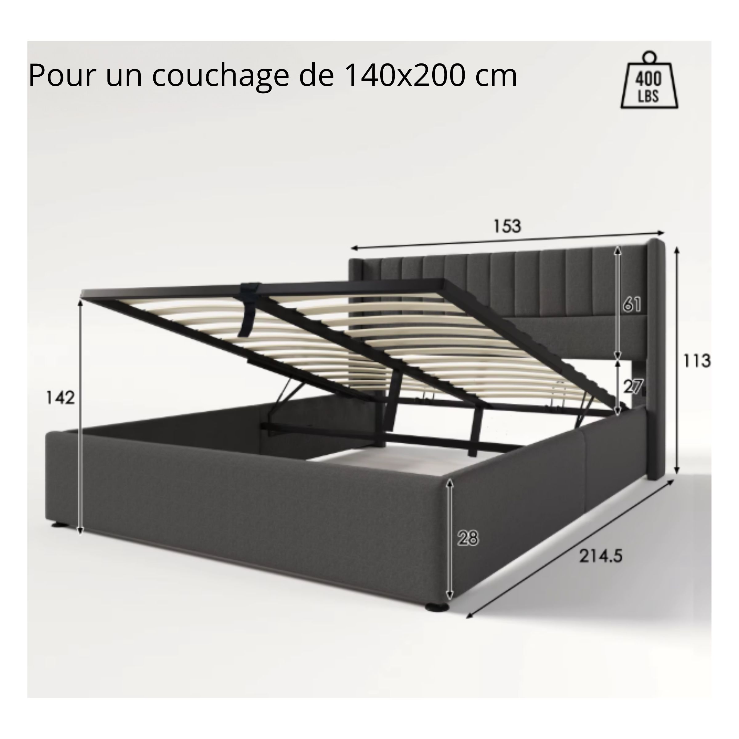 Un lit moderne et graphique avec tête de lit à bandes verticales, grand coffre de rangement XL, et ouverture hydraulique ultra simple grâce à sa poignée en tissu. Disponible en 140/160/180 x 200 cm, en gris élégant ou beige chaleureux.