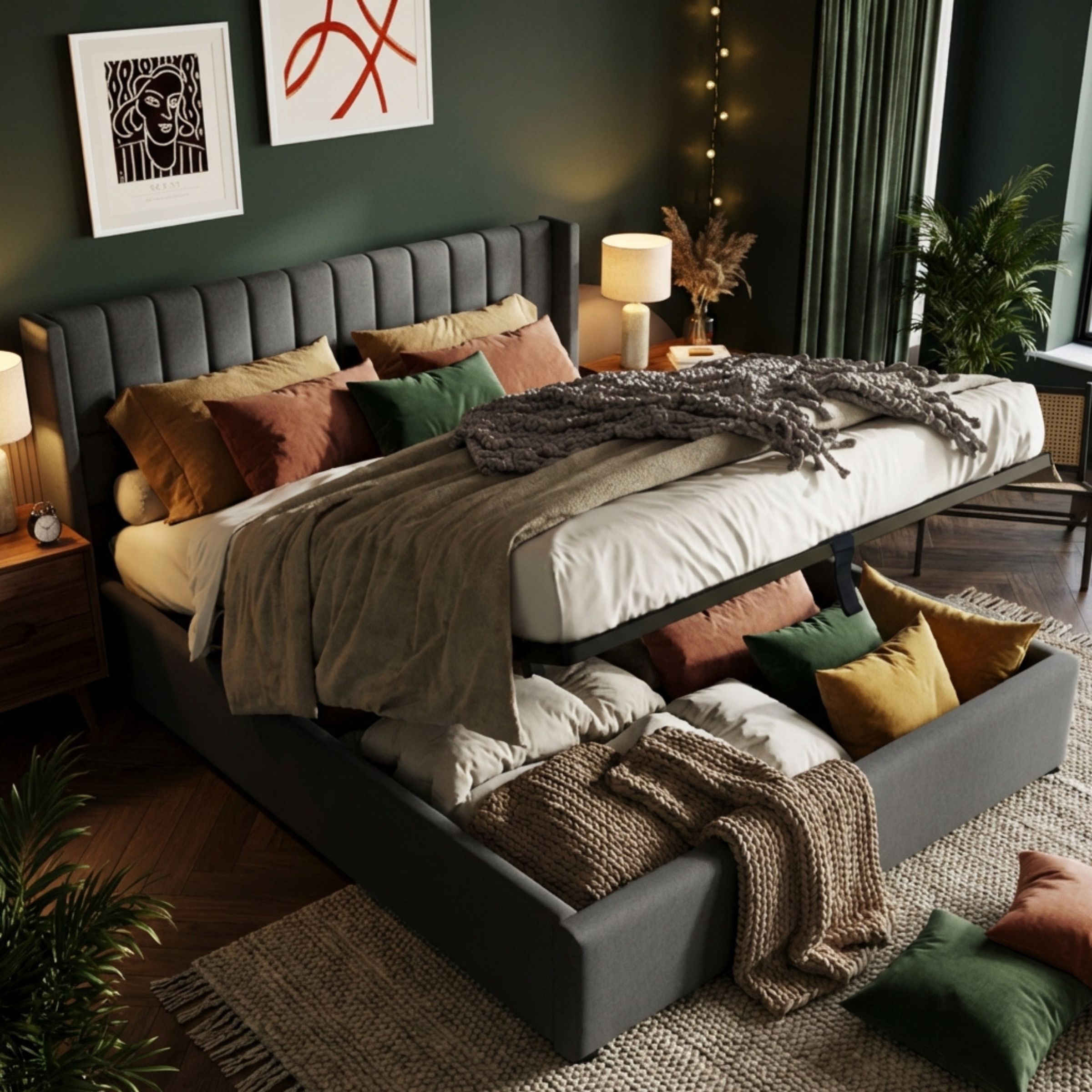 Côté pratique, c’est un vrai best-seller : le sommier se soulève sans effort grâce au système hydraulique et à la poignée en tissu. En un geste, vous accédez à un rangement XL sous toute la surface de couchage — parfait pour couettes, oreillers, linge de lit, valises ou vêtements hors saison. Le coffre étant fermé, tout reste plus propre et mieux protégé de la poussière.