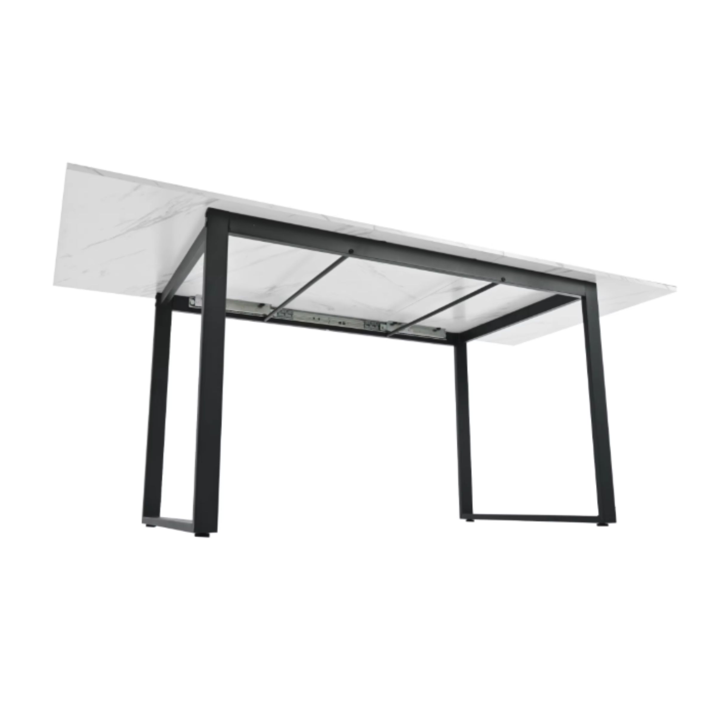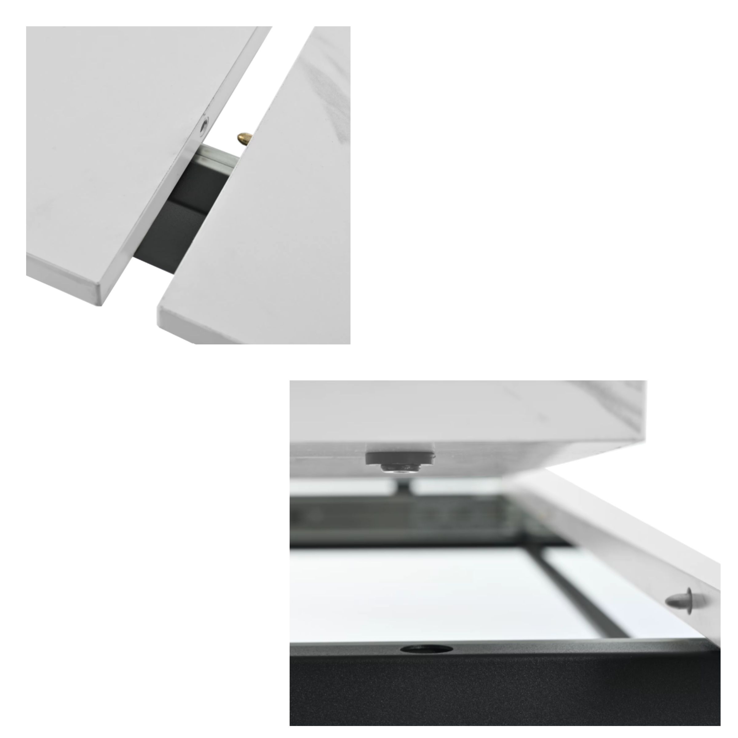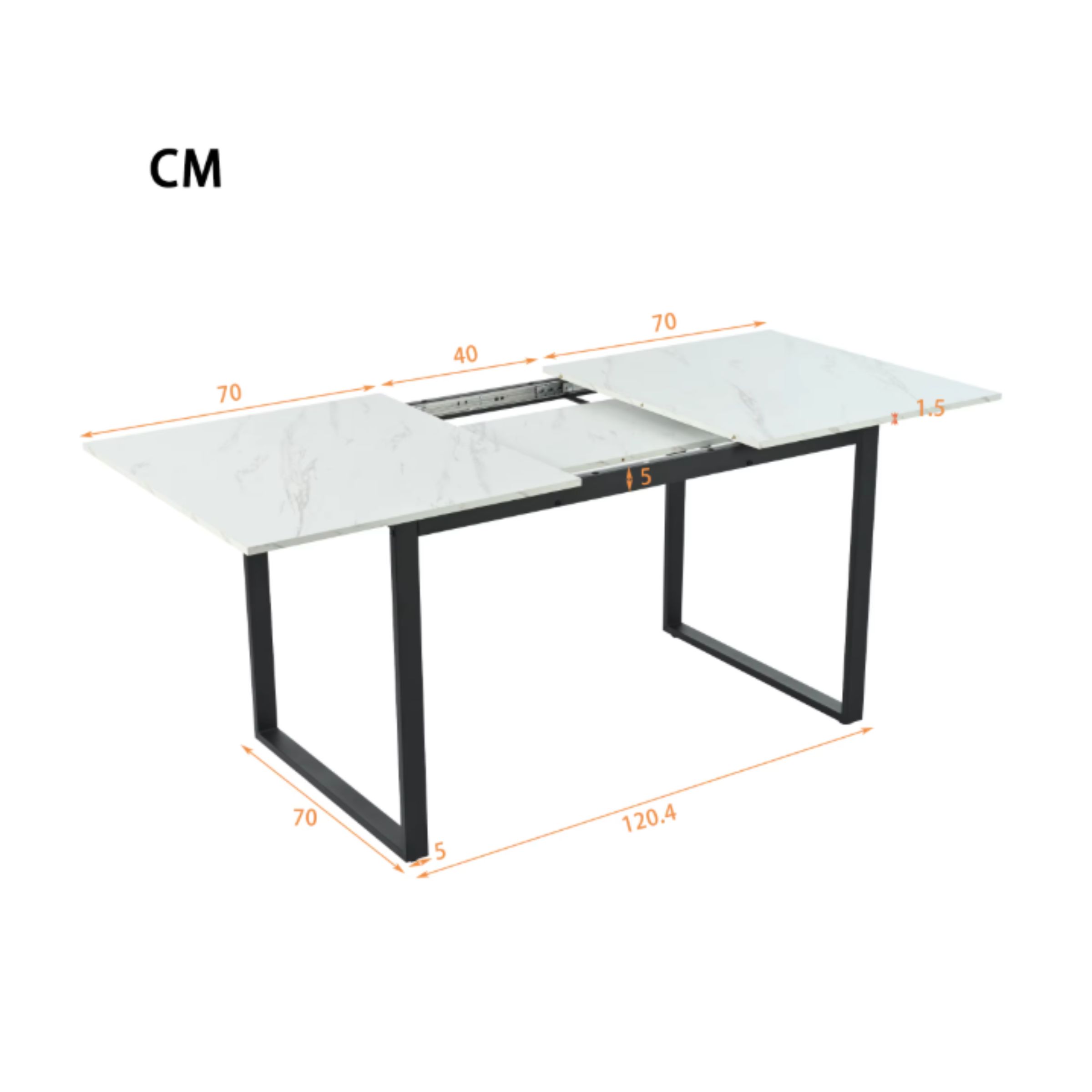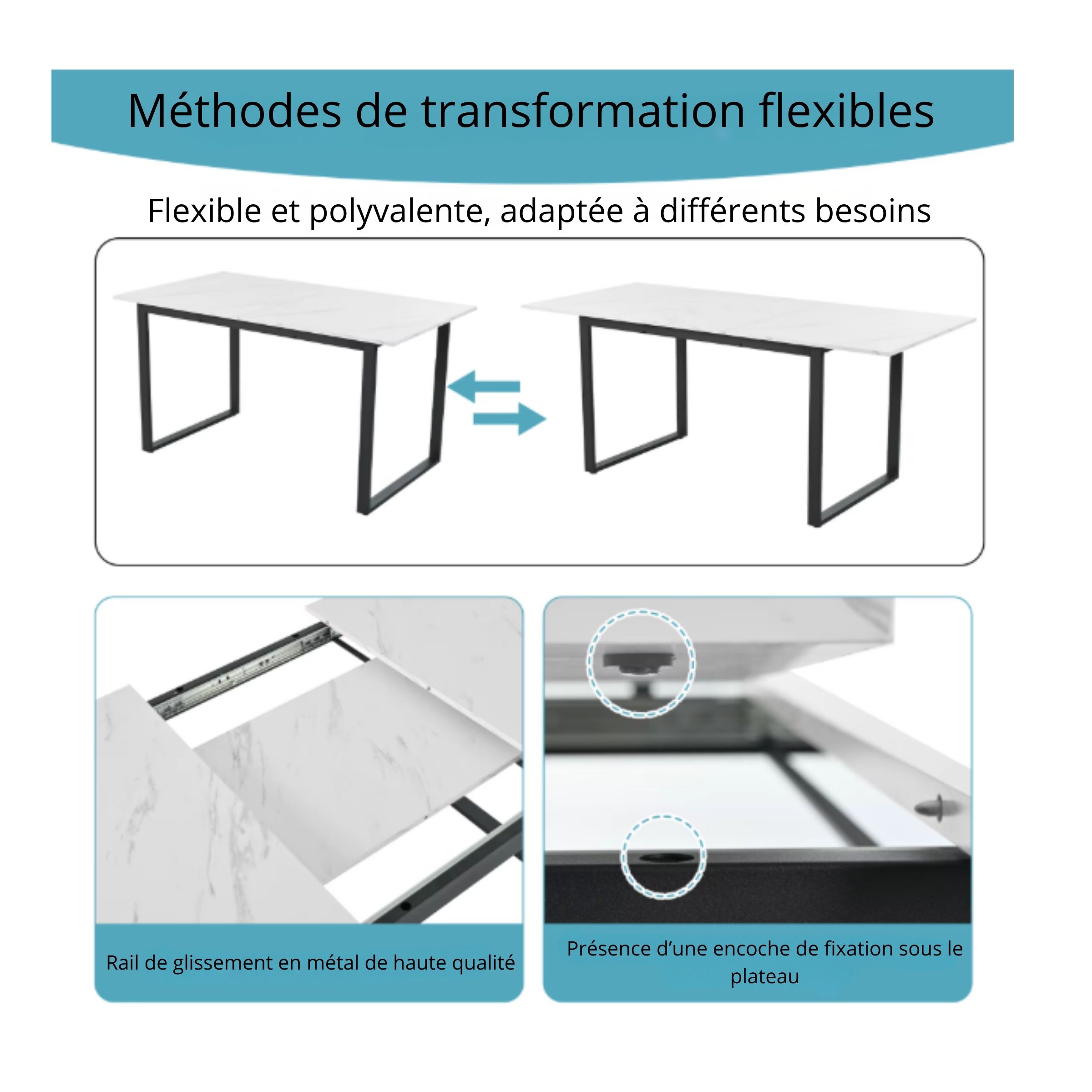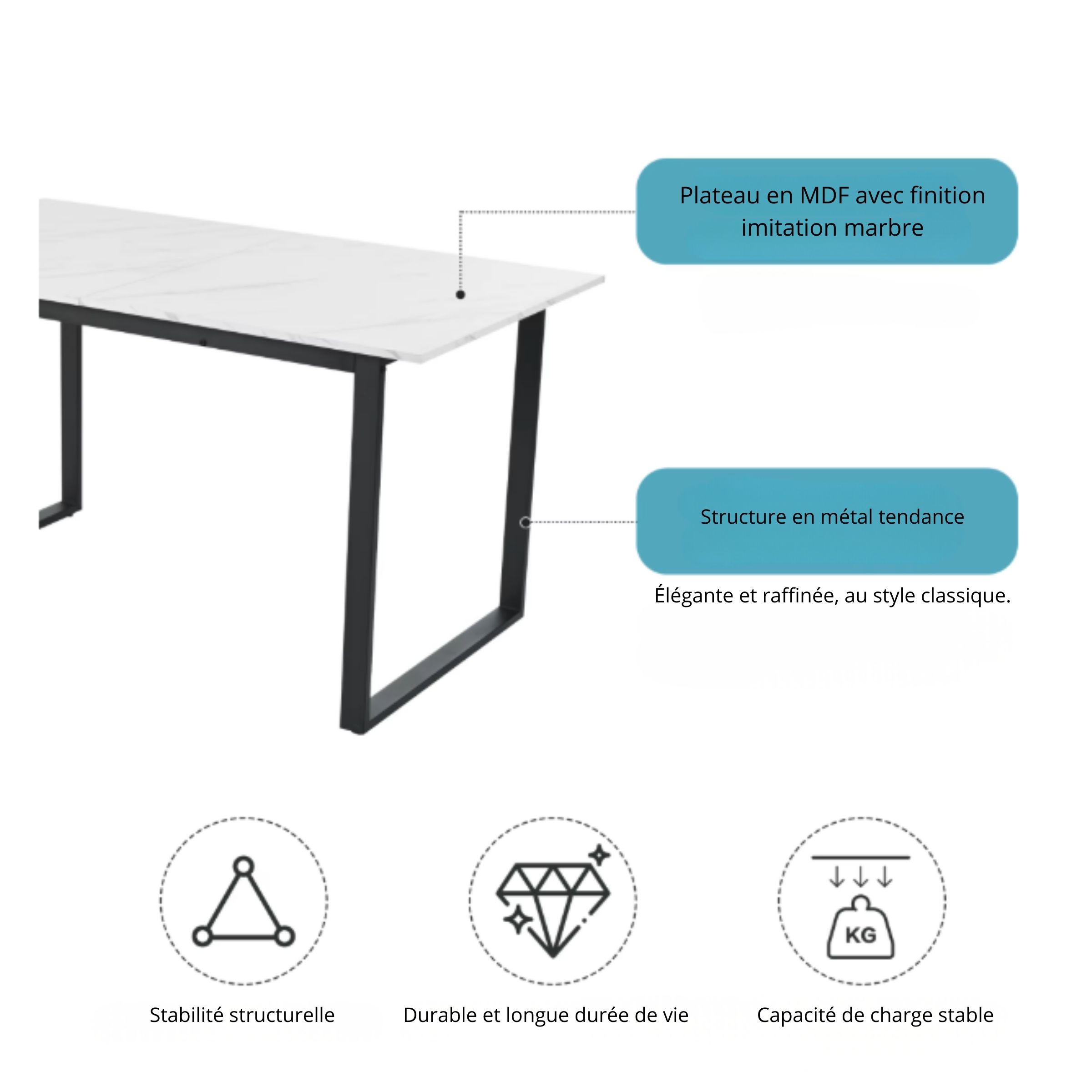 Cette table à manger moderne extensible a été pensée pour allier esthétique contemporaine et usage pratique. Son plateau en MDF effet marbre, composé de plusieurs panneaux assemblés, peut présenter de légères variations de motifs — un détail normal qui renforce son rendu visuel naturel et unique.